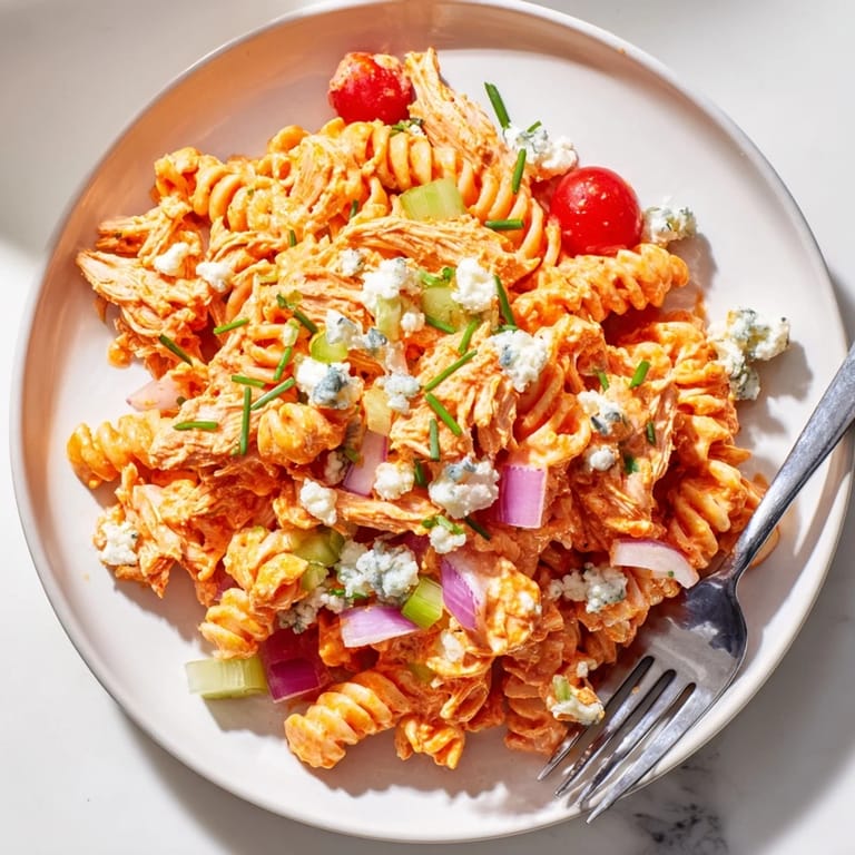 Merken An einem schwülen Juliabend brachte ich diesen Salat zu einem Grillfest mit, ohne große Erwartungen. Innerhalb von Minuten war die Schüssel leer, und drei Leute schrieben sich das Rezept auf ihre Handys. Die Kombination aus scharfer Buffalo-Sauce und kühlem Ranch-Dressing war genau das, wonach alle gesucht hatten, ohne es zu wissen. Seitdem ist dieser Nudelsalat mein Geheimwappen für jede sommerliche Zusammenkunft.