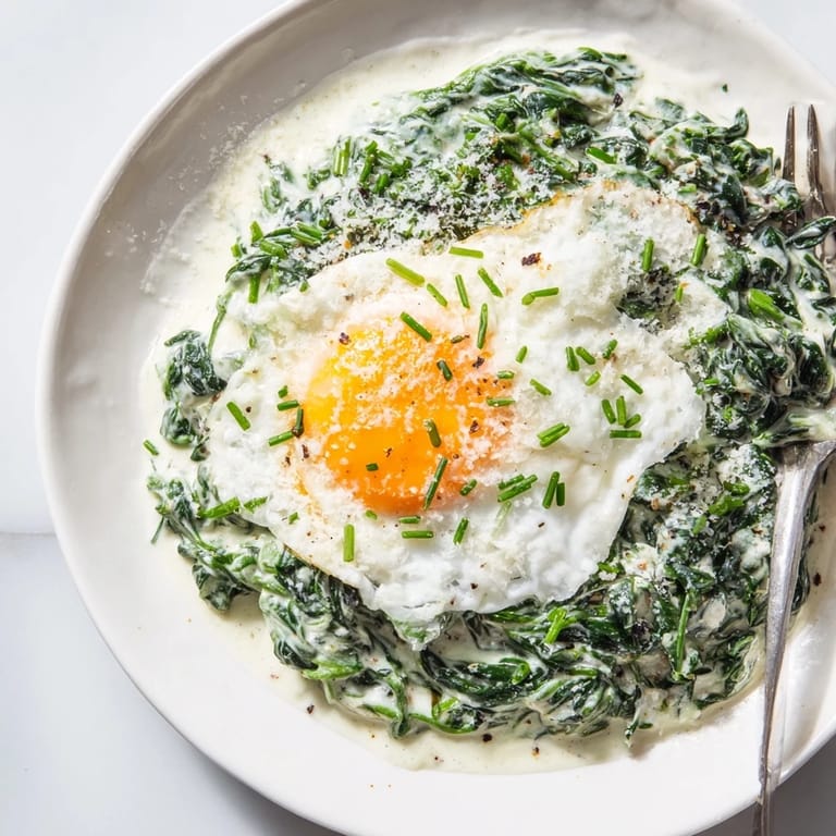 Merken Ein tröstliches Gericht aus seidigem Rahmspinat, gekrönt mit einem goldenen, knusprigen Spiegelei—perfekt für Brunch, Mittagessen oder ein leichtes Abendessen.