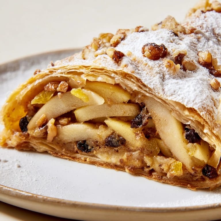 Merken Ein klassisches Dessert mit dünnem, blättrigem Teig, der eine warm gewürzte Apfelfüllung umschließt und goldbraun gebacken wird.