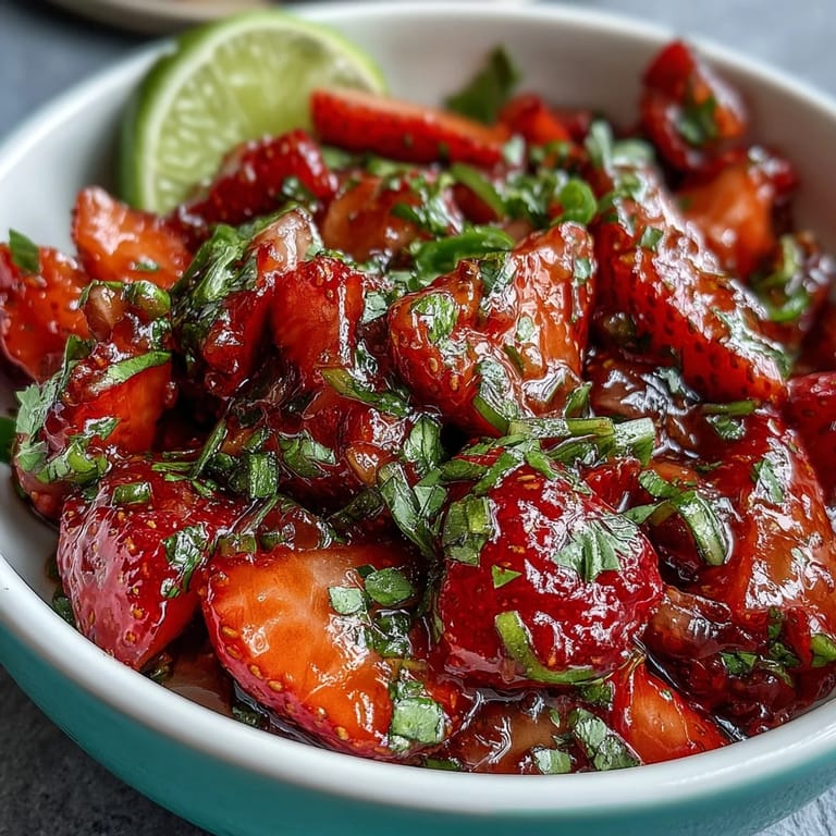 Merken Ich entdeckte diese Erdbeer-Salsa an einem unerwartet warmen Frühlingstag, als ich auf dem Markt vorbeikam und die ersten süßen Erdbeeren der Saison sah. Mein Freund hatte gerade Fisch gegrillt und ich brauchte etwas Frisches, das nicht die übliche Tomate war. In weniger als fünfzehn Minuten hatte ich diese leuchtend rote Mischung zusammen, und die überraschte Reaktion beim ersten Bissen zeigte mir, dass ich etwas Besonderes gefunden hatte. Seither ist sie mein geheimes Waffe für jeden Sommerabend und jeden unerwarteten Besuch.