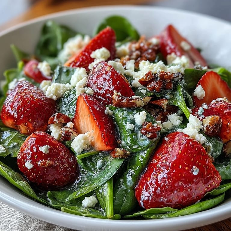 Merken Experience the perfect balance of sweet and savory with this Fresh Strawberry Spinach Salad with Poppyseed Dressing. Bursting with vibrant colors and fresh flavors, this salad combines juicy strawberries, tender baby spinach, tangy feta, and crunchy toasted nuts, all tied together with a creamy and slightly sweet poppyseed dressing. It’s an ideal dish for warm spring and summer days—quick to prepare, light, and packed with nutritious ingredients that delight every palate.
