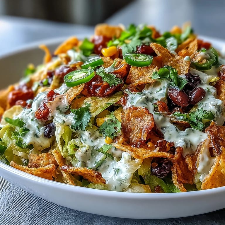 Merken Meine Schwester hat diesen Salat vor zwei Jahren auf ihrem Hochzeitsbuffet serviert und die Gäste rühren noch immer davon. Ihre Freundin Jessica schwört dass der Crunch der Fritos perfekt zur cremigen Note des Dressings passt.