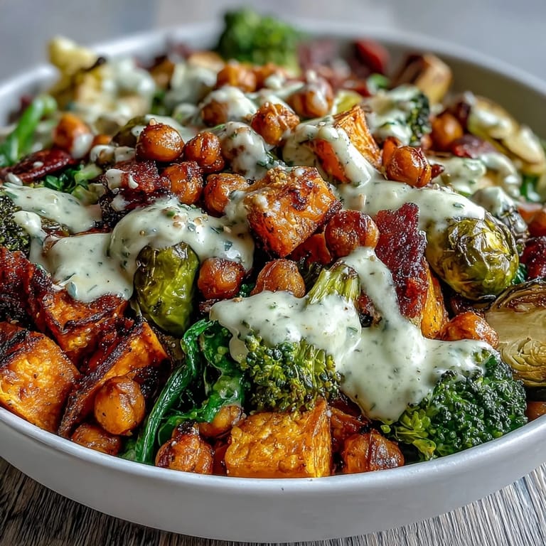Rucola oder Babyspinat unter die gerösteten Komponenten mischen, um eine frische, pfeffrige Note hinzuzufügen. Der Kontrast zwischen warmen, gerösteten Elementen und dem kühlen Grün macht den Bowl interessanter. Ich habe das zufällig entdeckt, als ich noch ein bisschen Rucola übrig hatte.