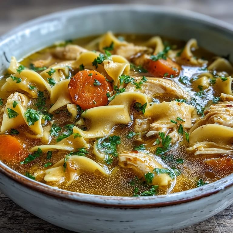 Ersetze die Eiernudeln durch glutenfreie Pasta für eine glutenfreie Version. Für eine vegetarische Variante nutze Kichererbsen statt Hähnchen und eine kräftige Gemüsebrühe.