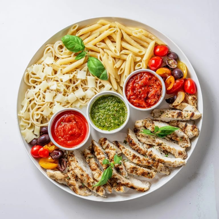 Merken Ich hatte diese Platte zum ersten Mal an einem Freitagabend zusammengestellt, als drei Freundinnen spontan vorbeikamen und ich keine Lust auf ein festgelegtes Menü hatte. Stattdessen kochte ich drei Nudelsorten, stellte ein paar Soßen bereit und ließ jede selbst zusammenstellen, was sie wollte. Das Hühnchen brutzelte nebenbei in der Pfanne, und plötzlich war aus meiner Notlösung das entspannteste Abendessen der Woche geworden. Seitdem mache ich diese Pasta-Platte regelmäßig – sie ist unkompliziert, macht Spaß und schmeckt jedes Mal anders.