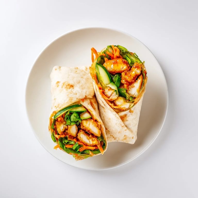 Vibrant wrap with juicy pan-seared chicken, sweet-spicy honey chili crisp sauce, and fresh crunchy vegetables rolled in a soft tortilla.