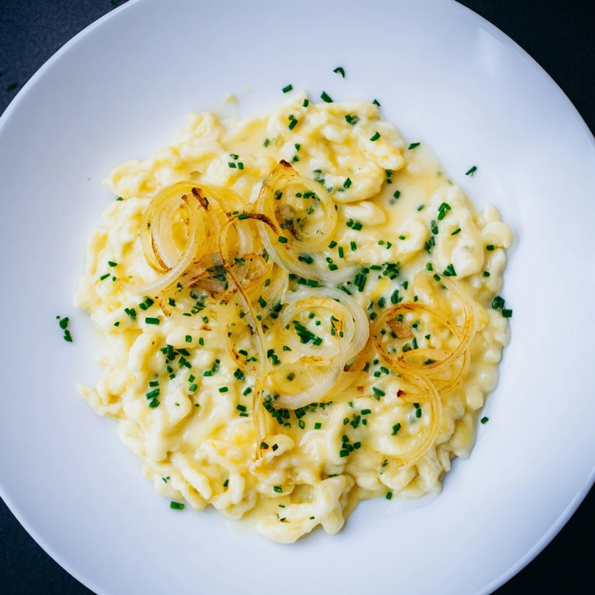 Merken Käsespätzle sind ein herzerwärmender bayerischer und schwäbischer Klassiker mit hausgemachten Spätzlen, die mit geschmolzenem Käse und karamellisierten Zwiebeln vermischt und bis zur goldbraunen Blässe gebacken werden.