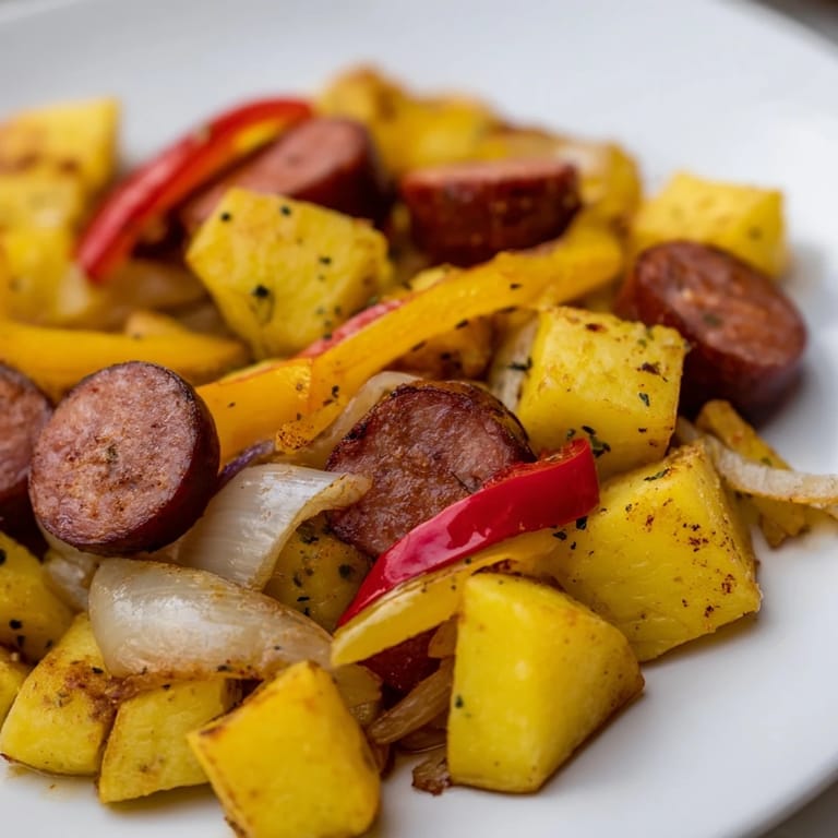 Merken Ein herzhaftes, wohltuendes Gericht mit rauchiger Kielbasa, zarten Kartoffeln und buntem Gemüse – alles zusammen in einem Topf für eine schnelle und befriedigende Familienmahlzeit zubereitet.