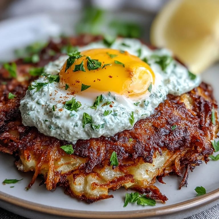 Als ich diese Rösti das erste Mal für Freunde machte, war ich nervös, ob Sellerie wirklich funktionieren würde. Einer meiner Gäste biss hinein, schwieg kurz und sagte dann: Das ist wie Rösti für Erwachsene. Seitdem ist dieses Gericht fester Bestandteil meiner Brunch-Runden. Die Leute lieben es, ihr Ei aufzubrechen und das flüssige Eigelb mit dem Joghurt zu vermischen.