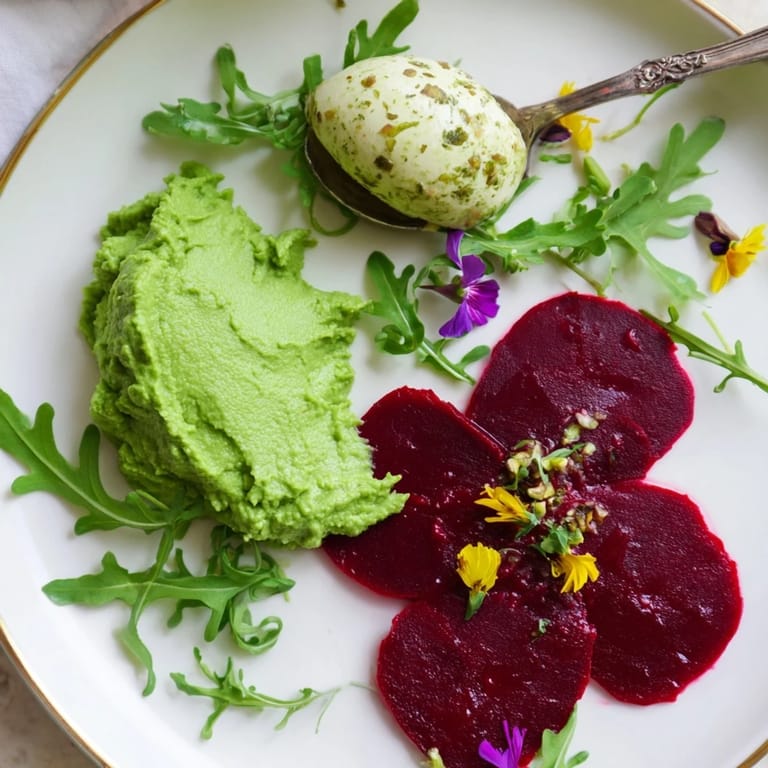 - Garnitur: Handvoll junger Rucolablätter, essbare Blüten (optional), extra gehackte Pistazien