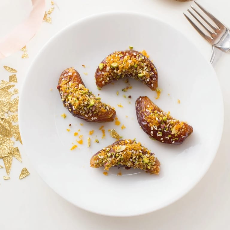 Bestreichen Sie die Datteln mit warmem Honig, bestreuen sie mit Sesamsamen und ergänzen optional essbare Goldblätter für einen luxuriösen Look.