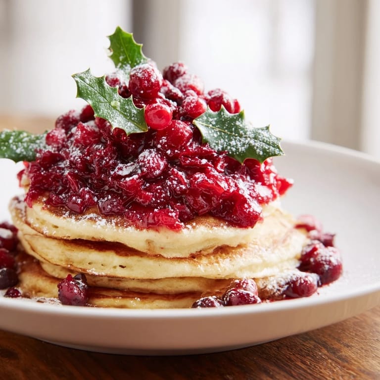 Merken Ein festliches und einladendes Brunch-Mittelstück mit fluffigen Pfannkuchen, hoch gestapelt und verziert mit einer lebendigen Beerensoße, die wie Stechpalmen aussieht, perfekt zum Teilen.