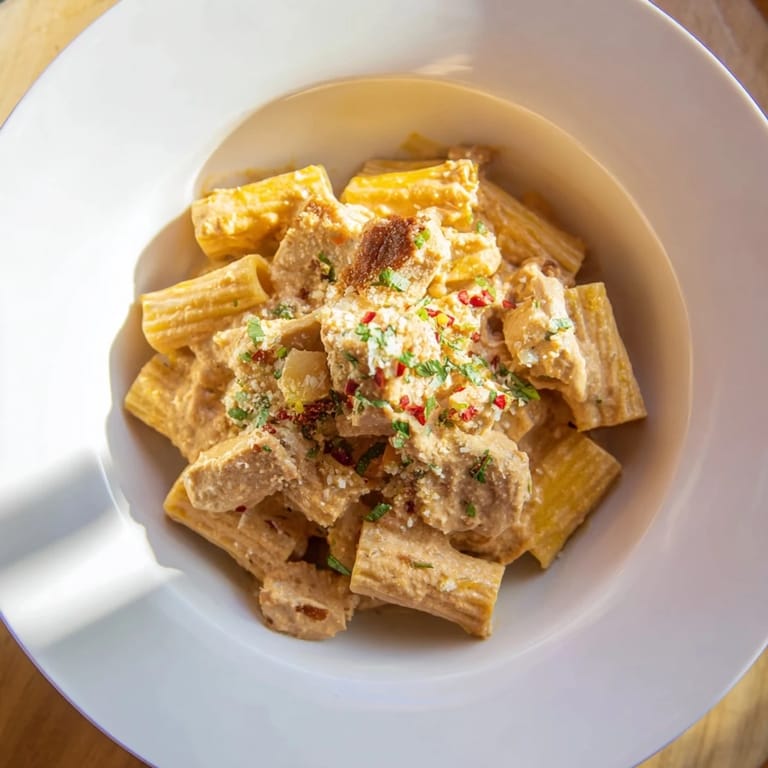 Merken Ich habe dieses Gericht zum ersten Mal an einem verregneten Donnerstagabend gemacht, als ich Lust auf etwas hatte, das gleichzeitig tröstlich und aufregend war. Die Kombination aus cremiger Tomatensauce, zartem Hähnchen und dieser rauchigen Schärfe vom Chili Crisp hat mich sofort überzeugt. Seitdem ist es mein Geheimtipp, wenn Freunde vorbeikommen und ich sie beeindrucken will, ohne stundenlang in der Küche zu stehen. Die Küche riecht dabei so verlockend nach Knoblauch und gerösteter Tomate, dass man kaum widerstehen kann. Es ist genau die Art von Pasta, bei der man immer noch einen Teller nachnimmt.