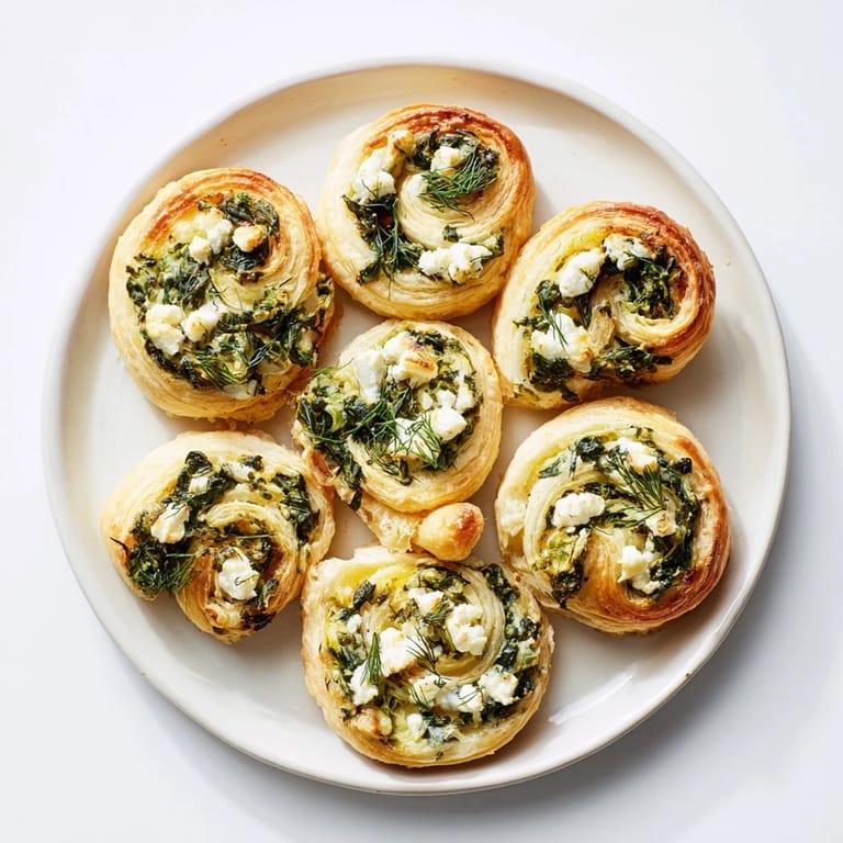 Merken Fluffige Blätterteigspiralen gefüllt mit cremigem Spinat und würzigem Feta, perfekt als Vorspeise oder Snack.