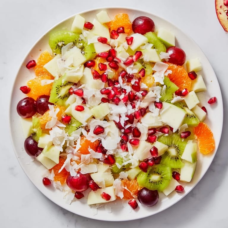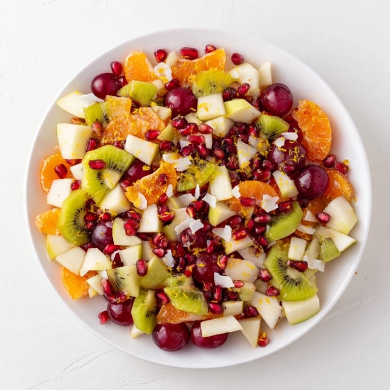 Merken Ein erfrischender Winterfruchtsalat mit einer Mischung aus saisonalen Früchten, vermischt in einem leichten Zitrus-Honig-Dressing und mit Kokosraspeln für eine festliche, schneebedeckte Optik.