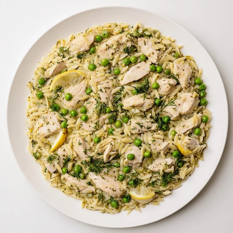Merken This Lemon Herb Chicken Orzo Skillet is a bright and comforting one-pan meal featuring tender chicken, orzo pasta, green peas, and fresh herbs, all simmered in a zesty lemon sauce—perfect for a light spring dinner. This Mediterranean-inspired dish is as simple to prepare as it is flavorful, making it an ideal choice for busy weeknights.